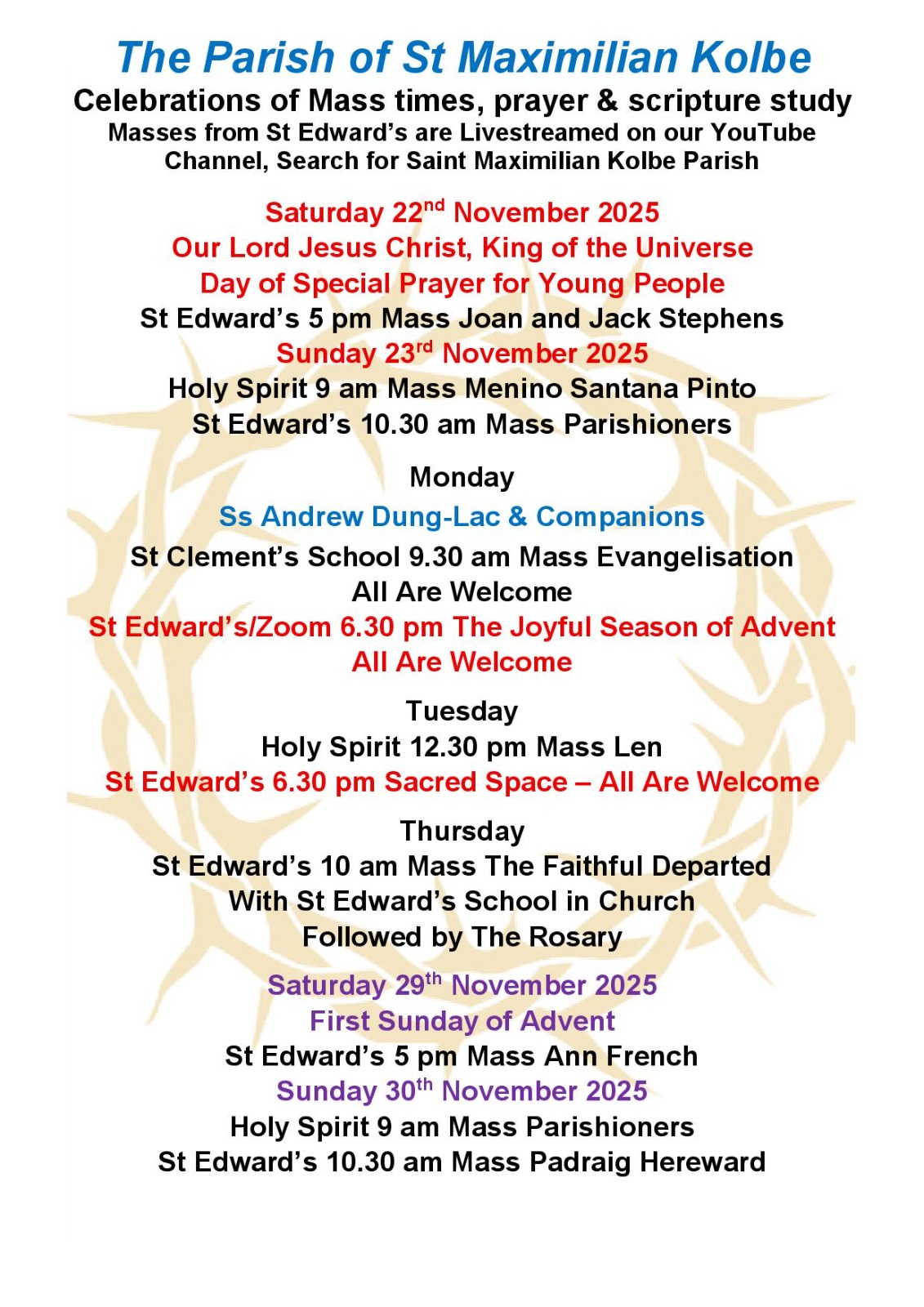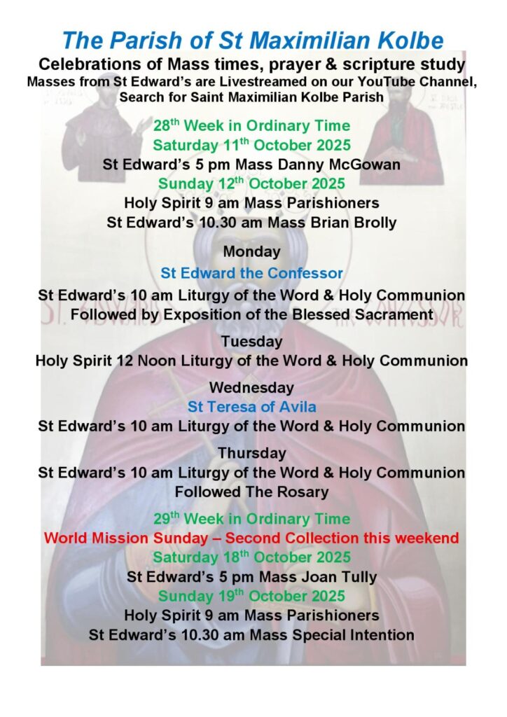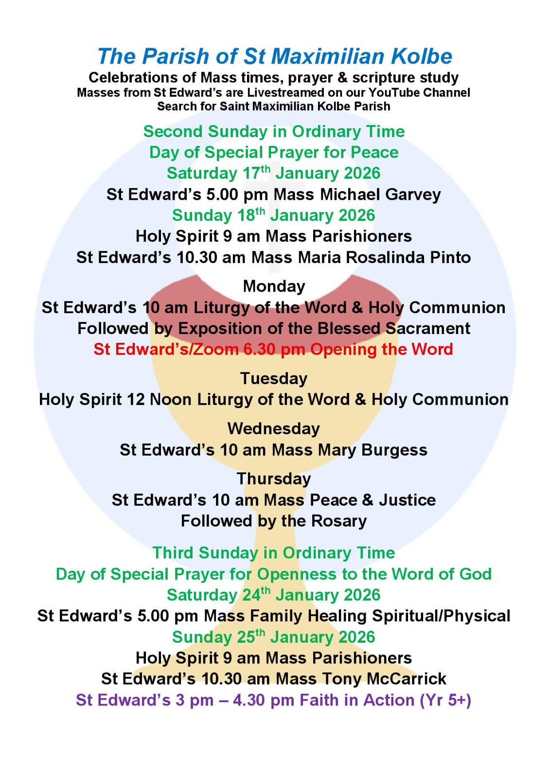 The Catholic Parish of Saint Maximilian Kolbe is committed to enabling each parishioner to encounter Jesus, love Jesus and desire to share the Good News of Jesus as we work for the Kingdom of God.